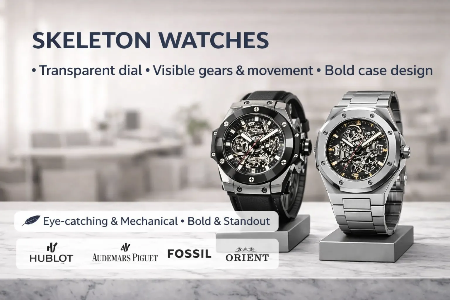A vintage watch gives a refined, classic feel, while a skeleton watch adds a premium, eye-catching touch.